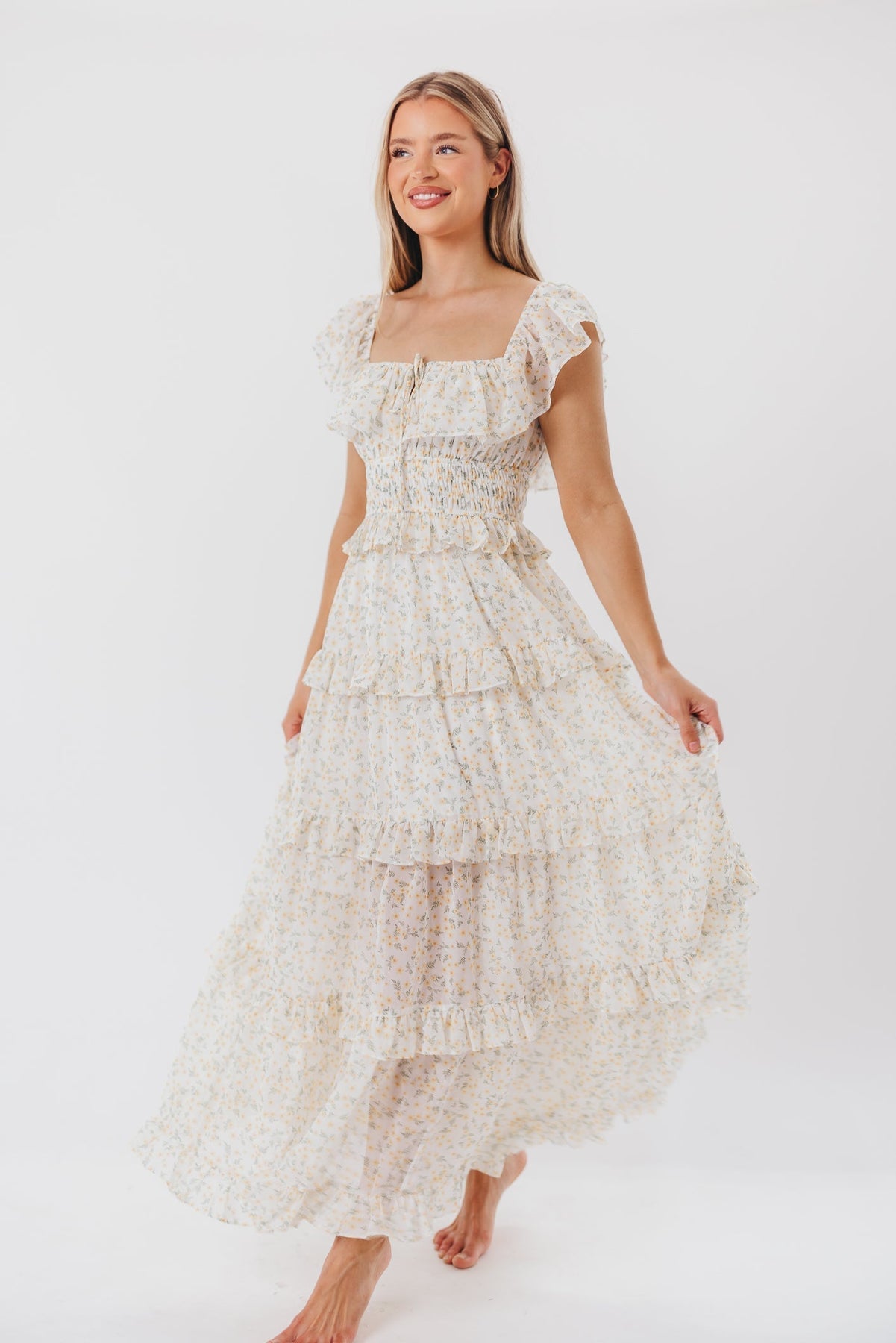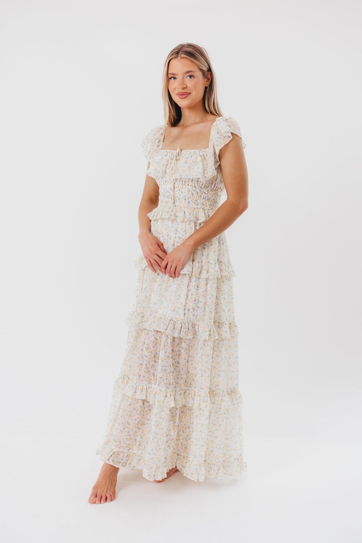 Astrid Maxikleid mit Rüschendetail in gelbem Blumenmuster – stoßfreundlich (geringer Lagerbestand)