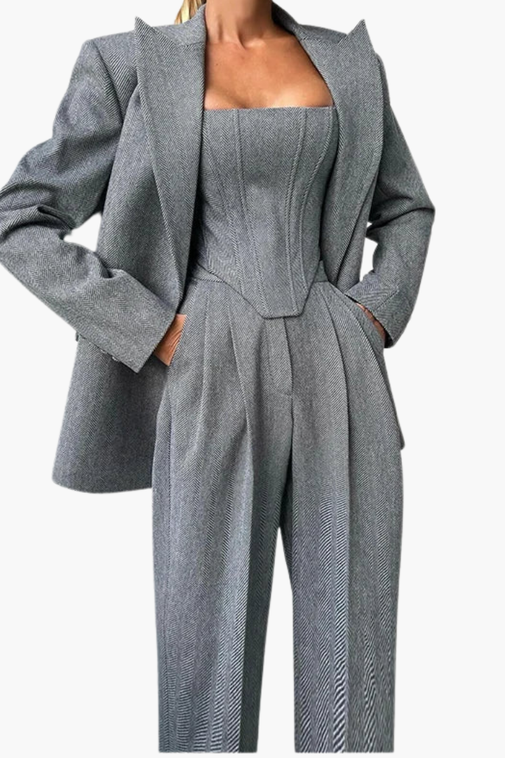 Unser beliebtes 3-teiliges Ensemble vereint Struktur, Raffinesse und kühne Weiblichkeit – entworfen, um einen bleibenden Eindruck in jedem Raum zu hinterlassen. Mit einem taillierten Blazer, einem konturierten Korsett und hochgeschnittenen Hosen bietet dieses meistverkaufte Power-Set unendliche Styling-Möglichkeiten und eine Silhouette, die Stärke und Anmut ausstrahlt.