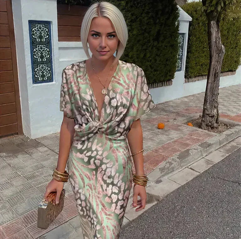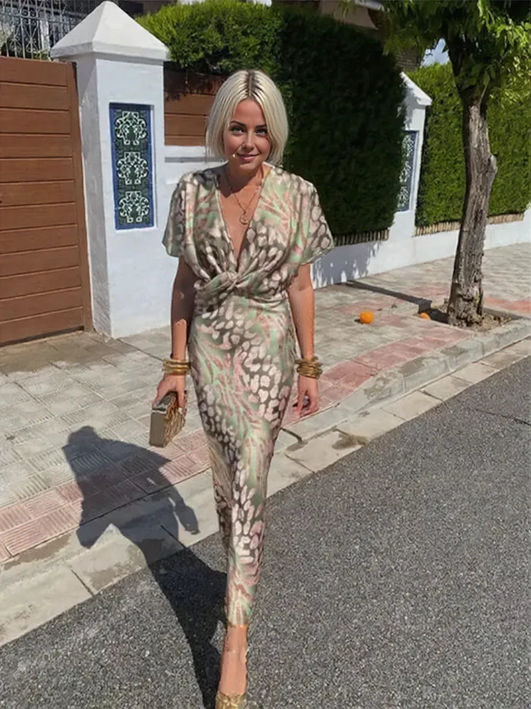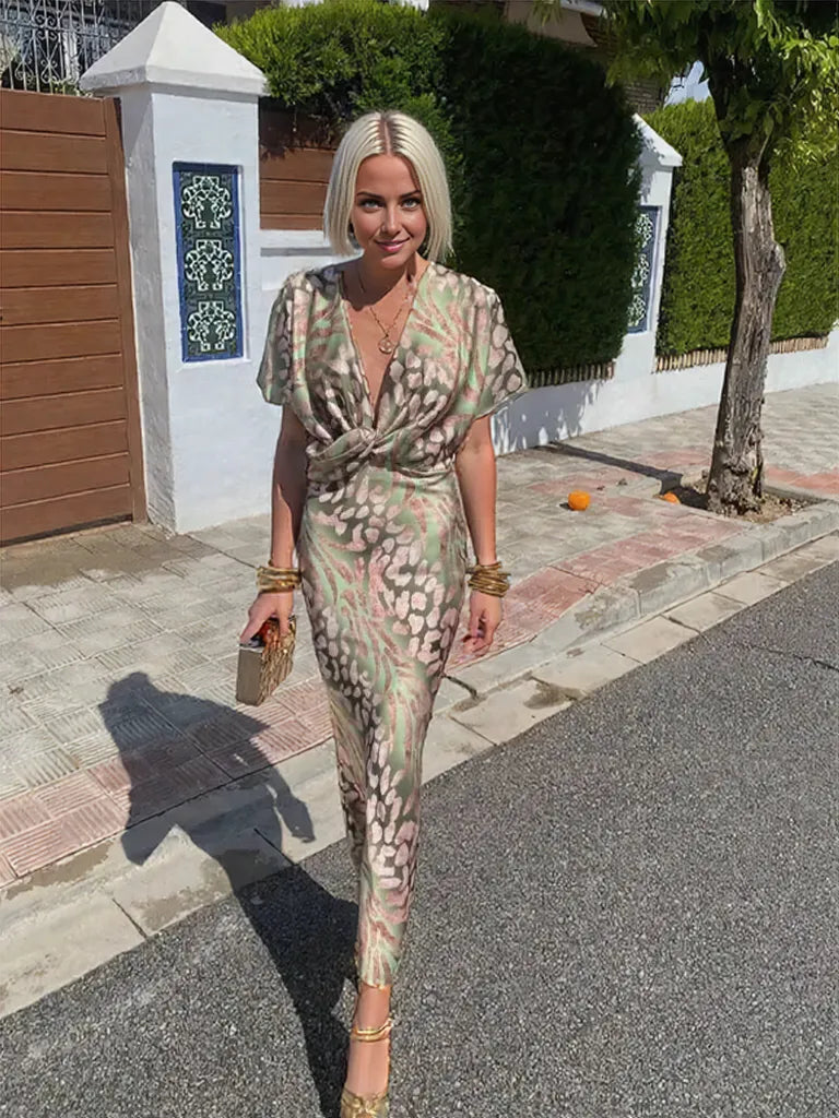 Dieses elegante Maxi-Kleid mit verdrehtem V-Ausschnitt bringt modernen Chic und schmeichelnde Raffinesse in Einklang. Der taillierte Schnitt setzt deine Figur gekonnt in Szene, während das raffinierte Twist Design im Brustbereich für einen edlen Hingucker sorgt. Ideal für Hochzeiten, Empfänge oder elegante Sommerabende, dieses Kleid ist vielseitig, komfortabel und einfach stilvoll.