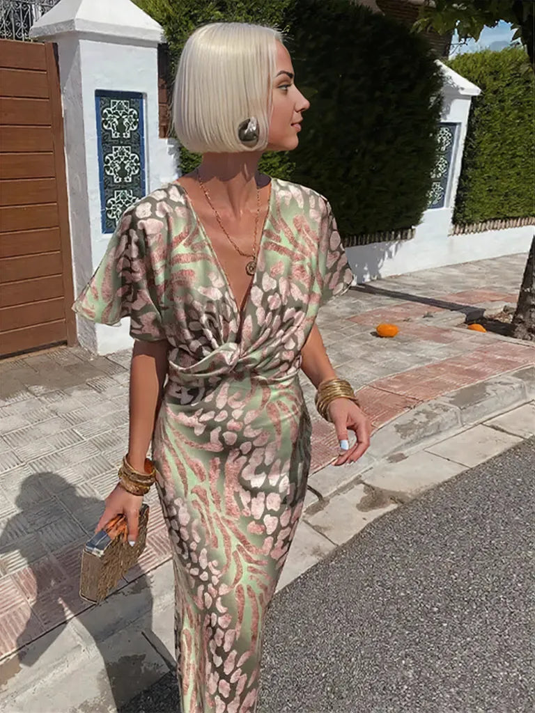 Raffinierter V-Ausschnitt: Der verdrehte Schnitt betont das Dekolleté und verleiht dem Look moderne Eleganz.