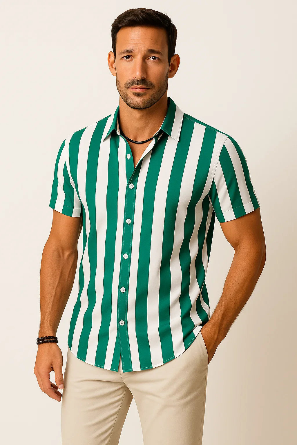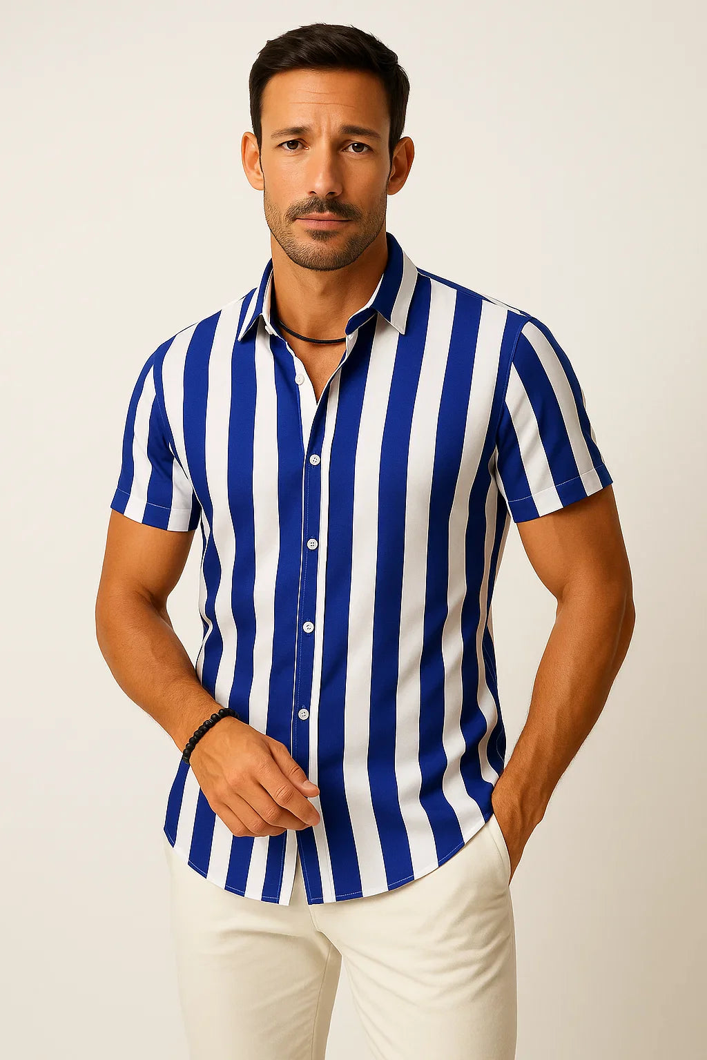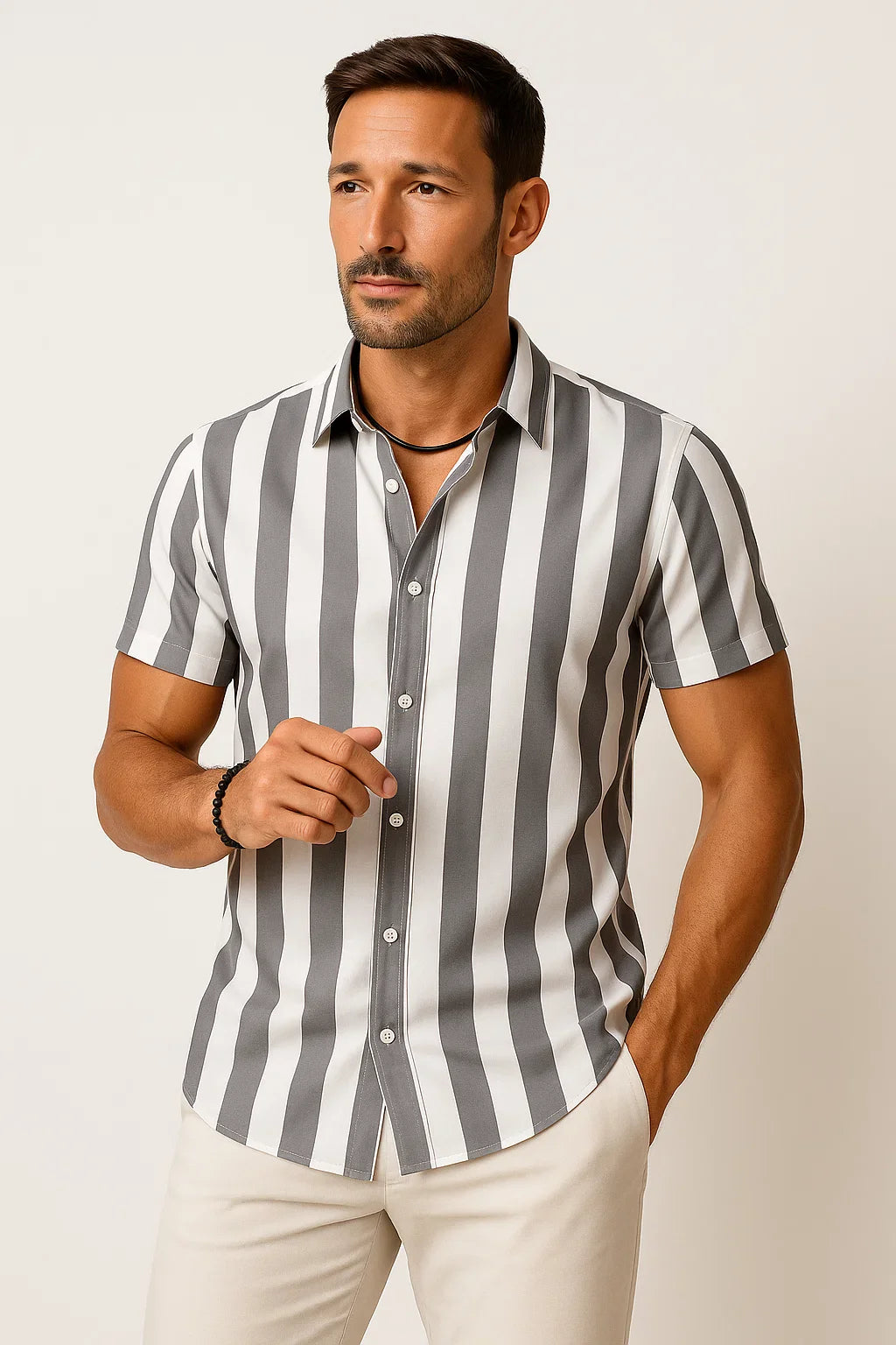 Dieses moderne Kurzarmhemd kombiniert zeitlosen Stil mit maximalem Tragekomfort. Das vertikal gestreifte Design schmeichelt der Silhouette und sorgt für eine dynamische Optik. Die klassische Knopfleiste und der entspannte Schnitt machen es zu einem vielseitigen Begleiter, ob lässig zur Jeans oder schick zur Stoffhose. Perfekt für warme Tage, stilbewusste Männer und mühelose Eleganz in jeder Situation.